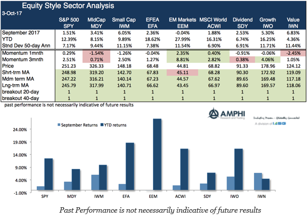 September was a month of transition for many styles, sectors, and class returns. In the style sector, small cap, growth, and value benchmarks generated strong performance under higher expectations for the reflation trade. There was a rotation from safer fixed income to higher risk premium styles. We are a long way from tax reform or a cut, but the fiscal issue is back on the table and in the minds of investors who want to get ahead of any changes.