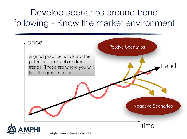 Scenario analysis can tell us something about the potential correlation of risks. A Fed tightening shock will likely have an impact on all emerging market debt. An oil shock will have an impact on the real economy and equity markets. Consequently, scenario analysis may help change the strategic weights or leverage within a portfolio. Although difficult, the mapping of scenarios to asset classes could be done systematically. Scenarios are a fundamental component of risk analysis. The biggest disconnects between trends and weighted scenarios are also likely the greatest risks. One can follow trends but still engage in scenario analysis to measure potential risks.