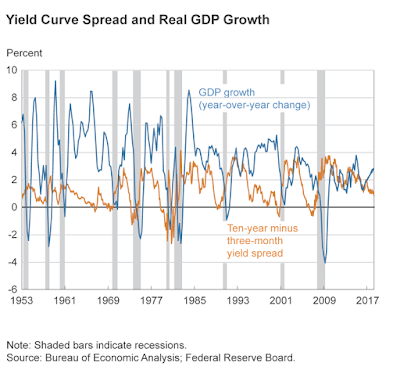 There are a number of measure to look at the yield curve signal, so it is important not to be focused on any single curve number; nevertheless, recent work from the Fed suggests that short-term signals may be better than long-term signals. See Fed Notes, (Don’t Fear) The Yield Curve which may be the most current thinking at the Fed. Eric Engstrom and Steven Sharpe find that a short-term forward spread signal does better than a long-term measure like the 2-10-year Treasury spread. The short-term forward spread has better explanatory power.