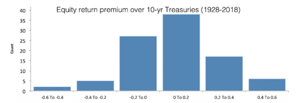 Additionally, the equity return premium over bonds is usually large. The arithmetic average is about 6.25 percent with a standard error of 2.25 percent.
