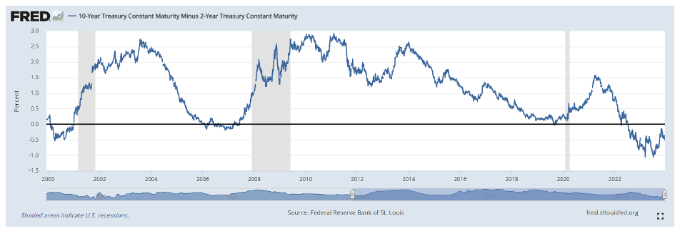 Often, investors look to the yield curve for clues about the future. While improving as of late, the yield curve hit its most inverted point since the early 80’s in June 2023. In simple terms, long-term treasury rates are running below their short-term level. You currently get paid more to loan the government money for two years than you do for ten. Intuitively, this does not make sense, but it displays a belief that despite the assertions of the Fed, investors believe that rates will drop soon. Most periods with inverted yield curves presage a recession, though many do not immediately. Given the recent prominence of government management of the economy, this could mean little or nothing. With a widely expected pause in rate increases, we see some normalization already.